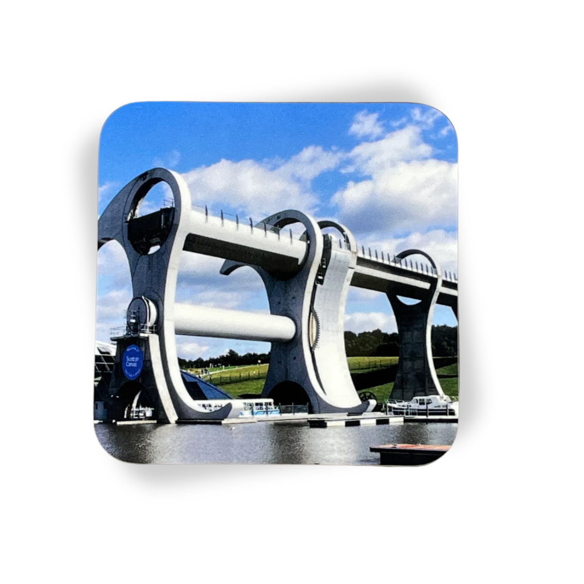 Bring a touch of Scottish engineering brilliance to your home with this beautifully crafted wooden coaster, featuring a vibrant daytime photograph of The Falkirk Wheel. Capturing the structure in natural daylight, the image highlights the Wheel’s elegant curves and impressive scale against a bright sky and tranquil water.